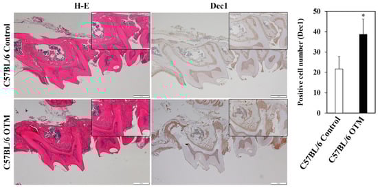 Dec1 is induced in the OTM of WT mouse tissues. Immunohistochemical staining revealed a higher expression of Dec1 in WT OTM mice compared to the control. Scale bars = 500 μm. All results are representative of at least three independent experiments. The data shown represent means ± SD; * p < 0.05.