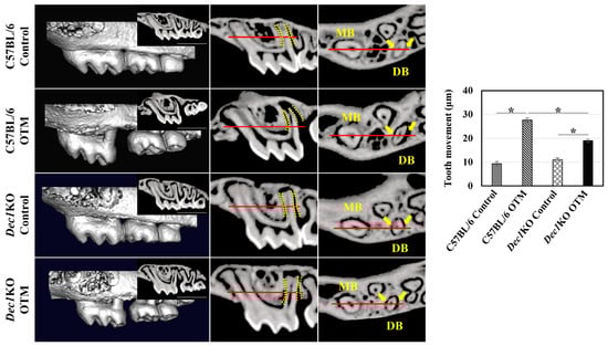 OTM and PDL width measurements. 3D images showing that the distance between the first and second molars in the WT OTM mice is much wider than in the Dec1KO OTM mice. OTM was quantified by measuring the minimum distance between the maxillary first and second molar crowns. Scale bars = 1 mm. The average PDL width was quantified by measuring the mean PDL space on the distal aspect of the distobuccal root in sagittal micro-CT images. The mid-root PDL width was measured in the horizontal micro-CT images. MB, mesiobuccal root; DB: distobuccal root. The data shown represent the means ± SD of at least three independent experiments; * p < 0.05.