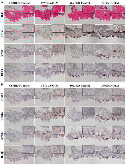 Immunohistochemical staining was used to determine the expression patterns of ribosomal proteins in the PDL fibroblasts. Interestingly, the degree of staining of RPL6, RPS7, RPL9, RPS12, RPS16, and RPS24 was markedly increased in WT OTM mice compared to Dec1KO OTM mice (Figure 8A,B). Dec1-deficient mice showed decreased expression of IL-1β in the OTM model (Figure 8B). Bax protein expression was decreased in Dec1KO OTM mice compared with WT OTM mice. Ki67 and fibronectin expression were increased in Dec1KO OTM mice (Figure 8C). Immunofluorescence staining (Figure 9) revealed that WT OTM mice had increased expression of RPL4 in PDL fibroblasts compared to Dec1KO OTM mice.