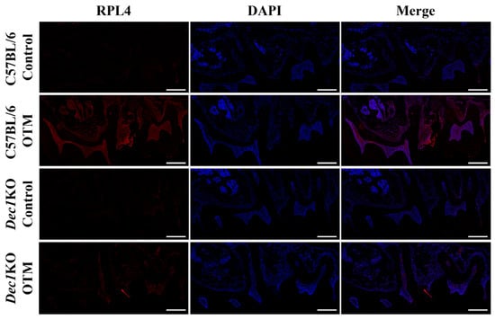 A deficiency of Dec1 reduces the expression of RPL4 in the OTM mouse model. Immunofluorescence analysis shows that the expression level of RPL4 decreased in Dec1KO OTM mice compared with WT OTM mice. Scale bars = 100 μm. All results are representative of at least three independent experiments.