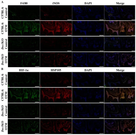 Next, the role of Dec1 in inflammation and the regulation of HSPs was determined in OTM mice. Double-immunofluorescence staining showed that the expression of F4/80 and iNOS were both induced in PDL fibroblasts in WT OTM mice compared to Dec1KO mice, thus validating the importance of Dec1 in inflammatory responses during OTM (Figure 10A). HIF-1α and HSP105 were also highly expressed in WT OTM mice, but were decreased in Dec1KO mice (Figure 10B).