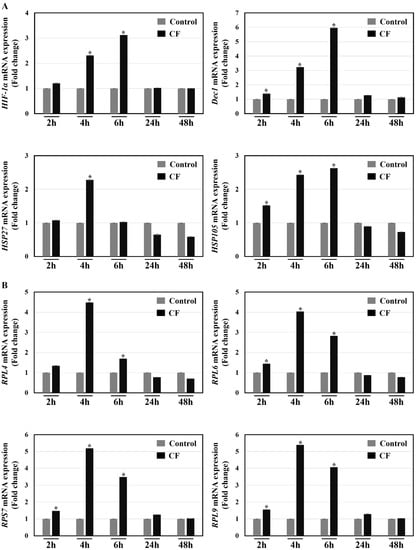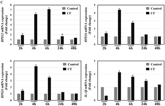Regulation of hypoxia-responsive genes, heat shock proteins, and ribosomal proteins in hPDL fibroblasts under compression force (CF). (A) Quantitative RT-PCR analysis reveals that the expression levels of HIF-1α, Dec1, HSP27, and HSP105 are induced at 4 and 6 h in the CF group. (B) CF treatment results in the induced expression of RPL4, RPL6, RPS7, and RPL9 in hPDL fibroblasts. (C) The expression levels of RPS12, RPS16, RPS24, and IL-1β were increased at 4 and 6 h in the CF group compared to the control group. The data shown represent means ± SD; * p < 0.05. All results are representative of experiments done in triplicate. CF, compression force.