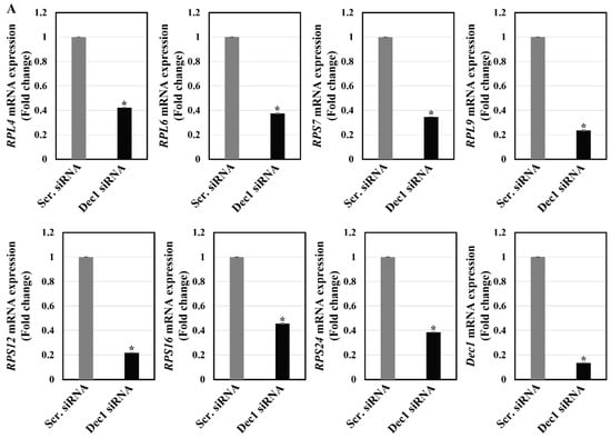 Dec1 knockdown inhibits the expression of ribosomal proteins in hPDL fibroblasts in a hypoxia environment. (A) Quantitative RT-PCR analysis reveals that the expression levels of ribosomal proteins, HIF-1α, HSP105, fibronectin and IL-1β are reduced in Dec1 siRNA transfected hPDL fibroblasts. The data shown represent means ± SD; * p < 0.05. All results are representative of experiments done in triplicate. (B) Western blot analyses reveal the suppressed expression of RPL4, RPL6, RPL9, RPS24, and Bax in the Dec1 siRNA transfected hPDL fibroblasts. The data shown represent the means ± SD of experiments carried out in triplicate; * p < 0.05. ns, not significant.