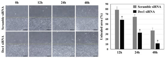 To further verify the effects of Dec1 on the wound healing process, the cell motility of hPDLFs was evaluated in wound healing assays after transfection of hPDL fibroblasts with Dec1 siRNA under hypoxic conditions. As shown in Figure 13, compared with the control group, cell migration ability was significantly increased in hPDL fibroblasts at all time points after Dec1 knockdown in the experimental group.