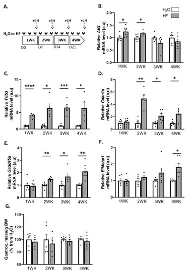 Halofuginone activates the expression of ATF4-regulated atrogenes in muscle without leading to atrophy. (A) Schematic representation of the experimental protocol, where mice received H2O (white bars) or HF (0.25 µg/g, grey bars) 3 times a week for up to 4 weeks (WK). Muscles were collected 6 h after the last HF administration at the end of each week (dotted arrows). (B–F) Relative mRNA levels in gastrocnemius for Atf4, Trib3, Cdkn1a, Gadd45a, and Eif4ebp1 were measured by RT-qPCR. Data were normalised using Tbp. Data are expressed as fold change vs. H2O within each week and are presented as individual values with mean bars ± SEM. (G) Gastrocnemius muscle mass per gram of body weight (BW). Data are expressed as a percentage from H2O within each week and presented as individual values with mean bars ± SEM. Statistics are described in Section 4. * padj < 0.05; ** padj < 0.01; *** padj < 0.001; **** padj < 0.0001.