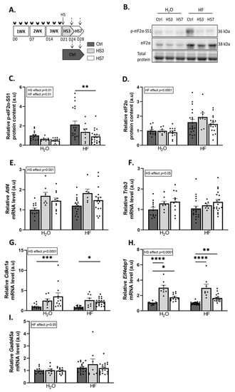 We then investigated the effect of the induction of the ATF4 pathway by HF treatment during the muscle atrophy induced by hindlimb suspension (HS). Briefly, mice received HF three times a week for 3 weeks and were then, 3 days after the last HF administration, hindlimb-suspended or not for 3 or 7 days (Figure 2A). Measurements were thus performed at least 6 days after the last HF administration. HF induces ATF4 activation through the phosphorylation of eIF2α [47]. We observed that HF treatment resulted in overall higher phosphorylated and total eIF2α protein levels compared to H2O-treated mice (Figure 2B–D). In addition, HS led to an overall decrease in phosphorylated eIF2α protein levels compared to the controls (Ctrls) (Figure 2B,C). In addition, levels of the mRNA encoding the phosphatase GADD34 (Ppp1r15a) were higher at 3 days of hindlimb suspension (HS3) compared to the Ctrls in both H2O- and HF-treated mice (Supplementary Figure S2). The expression of ATF4-regulated genes was not different between Ctrl-HF and Ctrl-H2O groups (Figure 2 and Supplementary Figure S2). The mRNA levels of Atf4 and its target genes involved in muscle atrophy, i.e., Trib3, Cdkn1a, and Eif4ebp1, were higher during HS in both H2O- and HF-treated mice (Figure 2E–H), while the mRNA levels of the ATF4-regulated atrogene Gadd45a remained unchanged (Figure 2I). Of note, mRNA expression of other ATF4 target genes remained unchanged for Asns or slightly decreased upon HS for Ddit3. (Supplementary Figure S2). Altogether, Figure 1 and Figure 2 shows that (i) HF administration induced ATF4-regulated atrogenes after 6 h, but no more after 6 days, indicating that this effect was rapid and transient, and (ii) HS induced overexpression of these atrogenes.