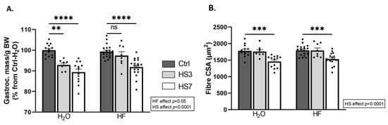 We next investigated the outcomes on skeletal muscle. Gastrocnemius muscle had atrophied only in H2O-treated mice after 3 days of HS (H2O-HS3) and in both H2O- and HF-treated mice after 7 days of HS. Surprisingly, the average of the fibre cross-sectional area (CSA) did not change in H2O-HS3 mice compared to the Ctrls but was lower after HS7 regardless of the treatment (Figure 3B). We further analysed the distribution of gastrocnemius fibre CSA (Supplementary Figure S3A,B). We reported (i) a lower proportion of small fibres and (ii) a higher proportion of large fibres in HF-treated mice compared to the H2O group (Supplementary Figure S3A). This observation was restricted to fast-twitch fibres (i.e., 2X/2B) (Supplementary Figure S3B). Taken together, our data suggest that induction of ATF4-regulated atrogenes is not associated with muscle atrophy after 3 days of hindlimb suspension in HF-treated mice and, thus, that HF slightly preserves muscle mass during HS.