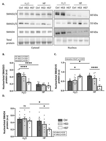 HF inhibits the TGF-β pathway [36,48]. We and others have recently reported that inhibition of the TGF-β signalling is associated with the concomitant activation of BMP signalling [45,46]. Therefore, we investigated how HF treatment and subsequent HS treatment affected these pathways in skeletal muscle. The nuclear localisation of SMADs mirrors the upstream activation of the TGF-β or BMP pathway [49]. We, thus, measured protein levels for the transcription factors SMAD2/3 (TGF-β signalling), SMAD1/5 (BMP signalling), and SMAD4 (TGF-β and BMP signalling) in nuclear and cytosolic fractions (Figure 4A–D and Supplementary Figure S4A–F). The ratio of nuclear SMAD2/3 to total SMAD2/3 was very low in HF-treated mice compared to H2O-treated mice and decreased upon HS only in H2O-treated mice (Figure 4A,B). Consistently, the overall mRNA levels of several collagens, which are well-known target genes of TGF-β signalling, decreased upon HS (Supplementary Figure S5). Moreover, the ratio of nuclear SMAD1/5 to total SMAD1/5 was higher in HF-Ctrl mice than in H2O-Ctrl mice. This ratio was reduced at HS7 compared to the Ctrl in HF-treated mice, while it was increased in H2O-treated mice (Figure 4A,C). Finally, the ratio of nuclear SMAD4 to total SMAD4 was overall lower in HF- vs. H2O-treated mice (Figure 4A–D), with a decrease in HF-treated mice at HS7 compared to the Ctrl.