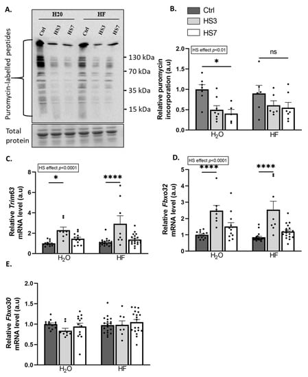 TGF-β catabolic action involves the inhibition of protein synthesis [40,50,51], whereas the anabolic action of BMP involves its promotion [44]. The overall protein-synthesis rates measured by puromycin incorporation were reduced during hindlimb suspension. However, this decrease was only significant in H2O-HS7 compared to H2O-Ctrl mice (Figure 5A,B). TGF-β signalling acts also as a negative regulator of muscle mass through the induction of the atrogenes TRIM63/MurF1 and FBXO32/Atrogin-1 [38,39], while BMP signalling acts as a positive regulator with the transcriptional repression of the atrogene FBXO30/Musa1 [44,45]. Trim63 and Fbxo32 mRNA levels were upregulated only at HS3 in both H2O and HF-treated mice, while mRNA levels for the atrogene Fbxo30 remained unchanged (Figure 5C–E). Our data suggest that while HF inhibits TGF-β signalling, it also promotes BMP signalling in the control gastrocnemius muscles. We also showed that HF partially attenuates the drop in protein synthesis during hindlimb suspension.