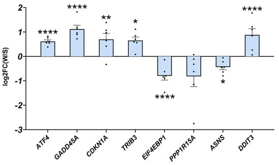 ATF4-regulated atrogenes are induced in atrophy-resistant hibernating brown bear muscles. Gene expression levels for ATF4, GADD45A, CDKN1A, TRIB3, EIF4EBP1, PPP1R15A, ASNS, and DDIT3 in vastus lateralis muscle of active and hibernating brown bears (n = 6 bears/season, the same individuals were sampled and analysed in summer and winter, log2FC winter/summer). Data are presented as individual values as log2FC with mean bars ± lfcSE (log2 fold change standard error). Statistics are described in [46]. * padj < 0.05; ** padj < 0.01; **** padj < 0.0001. FC: fold change; W: winter (hibernating season); S: summer (active season).