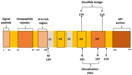 A small percentage (10–15%) of prion diseases may be related to genetic mutations in the prion gene (PRNP). PRNP is located on chromosome 20. The gene contains two exons. The first is a non-translating exon that contains the 5′-untranslated region (UTR) leader. Exon 2 includes the protein coding sequence and the 3′ UTR region. PrPc is 253 amino acids in length. Two post-translational cleavages of PrPC have been identified in the prion protein; they feature the removal of the first 22 amino acids in the N-terminal region and the last 23 amino acids in the C-terminal region. The C-terminal region, the glycophosphatidyl inositol (GPI) sequence, anchors prion proteins to cell membranes []. The PrPC protein contains three a helices, two small b sheet regions, a long N-terminal loop, and a short C-terminal loop []. The N-terminal area of prion protein contains five octapeptide repeats of the P(H/Q) GGG(G)WGQ sequence. The removal of one repeat may not result in any disease phenotype. However, insertions in several octapeptide sequences (OPRI) have been associated with prion diseases. []. A disulfide bond is formed between C179 and C214, located in helix 2 and 3, respectively. These cysteines are highly conserved and the disulfide bond plays a critical role in prion folding and stability []. Conserved glycine- and alanine-rich regions are located between A113 and Y128. This sequence may play a significant role in prion function and stability []. Two glycosylation sites were identified in PrPC (N181 and N197), which are occasionally occupied by complex N-glycans. These residues were suggested to play a crucial role in neuroprotection and in prevention of protein assembly and toxicity []. Figure 1 shows a schematic structure of prion protein with important positions and residues. The polymorph methionine 129 and glutamic acid 219 residues are also included.