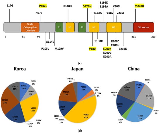 Genetic prion diseases can have diverse phenotypes, including Creutzfeldt–Jakob disease (CJD), fatal familial insomnia (FFI), and Gerstmann–Sträussler–Scheinker disease (GSS) []. Typical familial CJD is associated with rapid disease progression, short survival time (less than a year), and progressive dementia with motor dysfunctions (myoclonus, tremor). In the brain, PrPSc plaques may be associated with gliosis and neuronal loss. The initial symptom of GSS may be ataxia, or Parkinsonism (such as tremor, bradykinesia, rigidity, and postural instability) and dementia may appear later in life. The disease duration may be variable; several GSS patients may die within a year, while the majority of patients may survive for several (even more than 10) years. Amyloid plaques, which contain amyloid beta (Ab) peptide aggregates, may appear in the brain, particularly in the cerebellum. The initial symptoms of FFI usually include insomnia and dysautonomia, followed by motor and cognitive impairments in later disease stages. Disease duration may be relatively short; patients can die less than 2 years after disease onset. FFI neuropathy may be diverse and includes loss of thalamic nerves, thalamic atrophy, inferior olivary nucleus atrophy, or PrPSc deposition in the midbrain or hypothalamus []. All three genetic prion diseases may represent atypical forms of disease with different symptoms and longer or shorter disease durations. Furthermore, atypical disease phenotypes may also be related to genetic prion mutations. Several patients with prion mutations were diagnosed with Alzheimer’s disease (AD), frontotemporal dementia (FTD), and dementia with Lewy bodies (DLB). Similarities have been observed between prion diseases and other neurodegenerative diseases (AD and FTD), as all of these diseases are associated with misfolded protein aggregation (such as Ab, microtubule associated Tau protein). Also, PrPSc may accumulate together with Ab peptides or abnormally folded tau protein []. Besides the common prion disease-related variants in Asian patients (such as P102L, V180I, E200K, M232R), several unique rare variants have appeared in Korean, Chinese, and Japanese patients, which were reported only in a single patient (will be discussed later). The majority of rare mutations may not have strong evidence of pathogenicity, especially if they do not have any family history of disease or segregation cannot be proven [].