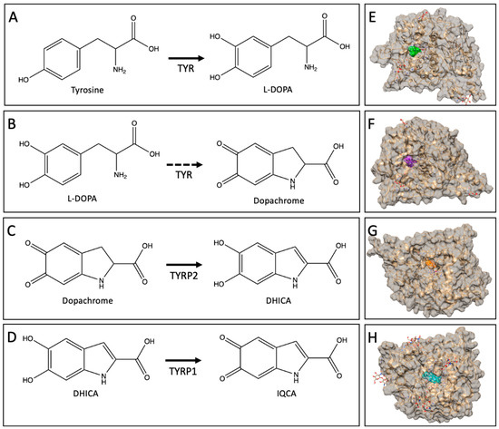 Key steps in melanogenesis pathway. (A) TYR catalyzes the conversion of tyrosine to L-DOPA. (B) TYR catalyzes L-DOPA to the intermediate dopaquinone (not pictured) to dopachrome. (C) TYRP2 catalyzes the conversion of dopachrome to DHICA. (D) TYRP1 catalyzes the conversion of DHICA to IQCA. The reactions are labeled as follows: TYR + L-DOPA, diphenol oxidation, and spontaneous conversion of dopaquinone to dopachrome; TYRP2 + dopachrome, dopachrome tautomerization; TYRP1+ DHICA, the oxidation of DHICA to IQCA. Panels E–H are visualizations done in CHIMERA (Version 1.15.0) with the surface of tyrosinases shown in beige. (E) Tyrosine, shown in green, docked to the active site. (F) L-DOPA, shown in purple, is docked in the active. (G) Dopachrome, in orange, is docked in TYRP2. (H) DHICA, shown in cyan, is docked to TYRP1.
