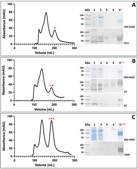 Purification profiles of lysates of recombinant human tyrosinases after 2nd step of purification using ÄKTAxpress. SEC profiles of TYR, TYRP2, and TYRP1 are shown in Panels (A–C), respectively. The inserts show the SDS-PAGE (top) and Western blot (bottom) analyses of the pellet before purification (1), lysate before purification (2), and the three peaks (3, 4, and 5). A protein of interest was identified in the third peak from the left (red asterisks) with an expected weight of ~60 kDa. T311, anti-TYR antibody; C9 and B7, anti-TYRP2 antibodies; TA99, anti-TYRP1 antibody.