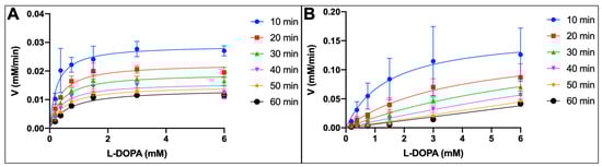The maximum velocity (Vmax) of diphenol oxidase reaction as a function of L-DOPA concentration for control and TYR-MB nanoparticles. (A) The control TYR. (B) TYR-MB nanoparticles. The measurement was repeated from 10 to 60 min at 10 min intervals. For each time point, the measurements of the Vmax were obtained in triplicates and averaged, and standard errors were calculated.