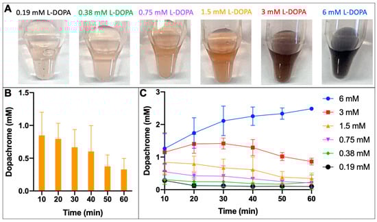 We monitored the dopachrome yield at each concentration of L-DOPA used every 10 min for 60 min to find the optimum conditions to produce native dopachrome (Figure 4). The different concentrations of L-DOPA produced a significant color change at the end of the reaction from clear through orange to black (Figure 4A). The color of dopachrome is a bright orange, achieved by using 1.5 mM L-DOPA. The higher concentrations (3 and 6 mM) of L-DOPA resulted in a black color, which indicates melanin-like products at the end of the melanogenesis pathway. The lack of color at the lower concentrations (0.19 and 0.38 mM) of L-DOPA indicated little to no dopachrome production. When 1.5 mM L-DOPA was used, the production of native dopachrome was at its maximum at 10 min (Figure 4B) of incubation and decreased after that as shown by the orange line (Figure 4B,C).