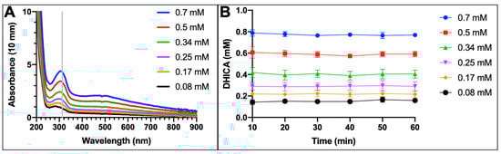 The activity of the product of the TYRP2 reaction was confirmed using the commercial DHICA reagent and demonstrated a peak of absorbance at the same wavelength of 315 nm (Supplementary Figure S1B). This concludes that the absorbance of the product formed in the TYRP2 and native dopachrome reaction matches the absorbance of the commercial product of DHICA (Figure 5A and Figure S1B), suggesting that native dopachrome can be used as a substrate in the TYRP2 reaction. This conclusion was further confirmed in the experiment when the concentration of native dopachrome was increased, which caused a larger peak at 315 nm, which indicates a higher concentration of DHICA forming (Figure 5). Consequently, the concentration of DHICA at a wavelength of 315 nm was calculated for each concentration throughout the 1 h reaction (Figure 5B). In our attempts at Michaelis–Menten analysis, the velocity of the reaction did not reach a maximum point, indicating that the active site of the enzyme was not fully saturated despite using the highest concentration of dopachrome achieved in the TYR-MB isolation.