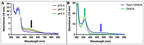 To test the enzymatic activity of the third key enzyme in the melanogenesis pathway, the commercial DHICA was used as a substrate. The product of the TYRP1 oxidase activity has only previously been shown with the use of MBTH, which traps the product and forms a dye complex visible at 505 nm [25]. Other studies have investigated the role and activity of TYRP1 in an environment mimicking the pH of the ER and melanosome, which showed higher activity under melanosome conditions (pH 5.5), which contradicts this report [16,17]. However, earlier reports have not shown the activity of TYRP1 activity with only the substrate and enzyme in the reaction. In the present work, for the first time, we have shown that after 24 h of incubation at 37 °C, it is possible to observe the product of the TYRP1-catalyzed reaction (IQCA) identified spectrophotometrically with a broad peak with the maximum at 560 nm (Figure 6B). This proposes that the last step of the melanogenesis pathway might be a slow reaction.