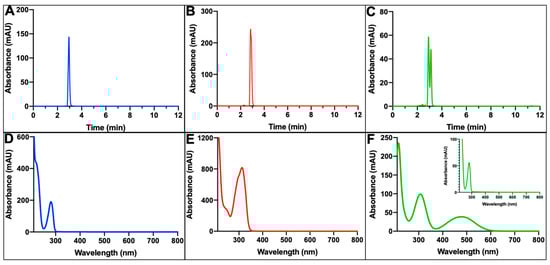 L-DOPA, DHICA, and native dopachrome are identified through HPLC. (A) The standard of L-DOPA (1.5 mM) has a retention time of 2.939 0.024 min. (B) The standard of DHICA (1.5 mM) has a retention time of 2.864 0.054 min. (C) The sample of native dopachrome was eluted with two retention times at 2.913 0.024 min and 3.110 0.027 min. (D) The peak at 2.939 retention time has an absorbance spectrum with a peak at 280 nm. (E) The peak at 2.864 retention time has an absorbance spectrum with a peak at 315 nm. (F) The peak at 2.913 retention time has an absorbance spectrum with a peak at 280 nm (seen in the insert). The peak at 3.110 retention time has an absorbance spectrum with peaks at 310 and 475 nm.