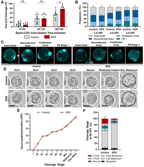2.1. Timing of Fertilization and Early Embryo Cleavages Are Similar between SER- and Control-Generated Embryos