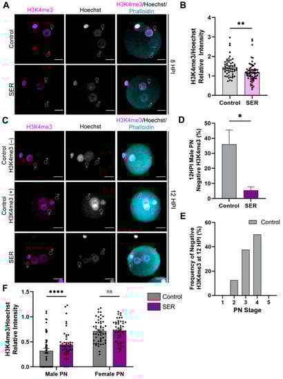 In mouse embryos, zygotic transcription initiates during the first cell cycle and increases after the first cleavage at the late two-cell stage. Histone modifications are major regulators of transcription during ZGA. To evaluate potential impacts of sperm SER treatment on early embryogenesis, we investigated the status of histone modification markers related to active transcription at different time points during the minor wave of ZGA. First, we analyzed the levels of H3K4me3 by immunofluorescence, normalized to nuclear DNA content. Consistent with existing reports on control embryos, at 8 HPI, only the female PN displayed H3K4me3 signal in both the control- and SER-generated embryos (Figure 3A). Interestingly, the relative intensity of H3K4me3 signal in the female PN decreased in SER-generated embryos (Figure 3B). At 12 HPI, nearly all the SER-generated embryos presented H3K4me3 signal in both the female and male PN, in contrast to control-generated embryos where a large population of embryos exhibited H3K4me3 only in the female PN (Figure 3C,D). We further analyzed whether the lack of H3K4me3 signal in the male PN of some of the control-generated embryos was merely a consequence of a less advanced pronuclear stage. We found no correlation between lack of signal in the male PN and pronuclear stage as even embryos in the advanced PN stage lacked H3K4me3 signal in the male PN (Figure 3E). At 12 HPI, the relative intensity of H3K4me3 was increased in the male PN of SER embryos (Figure 3F). These results indicate that SER results in a more homogeneous population of embryos regarding chromatin status, and that this is independent of the SER effects on pronuclear stage.