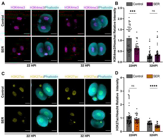 We continued to investigate whether SER effects on histone modifications sustained through the process of the major ZGA by evaluating two-cell embryos at 22 and 32 HPI. The signal for both H3K4me3 and H3K27ac has been well documented to diminish by the end of the major ZGA in mouse embryos []. Therefore, we extended our analysis to include quantifying the relative intensity of H3K4me3 by 3D-confocal microscopy at 22 HPI and 32 HPI (Figure 5A,B). Interestingly, SER-generated embryos exhibited an accelerated loss of H3K4me3 signal at 22 HPI, compared with control embryos where similarly low H3K4me3 levels were observed at 32 HPI. When evaluating H3K27ac intensity, we observed a similar trend at 22 HPI, with two subpopulations of control-generated embryos differing in their levels of H3K27ac (Figure 5C,D). Again, our results indicated that the histone modifications’ kinetics were accelerated in the SER-generated embryos in comparison to the control-generated embryos.