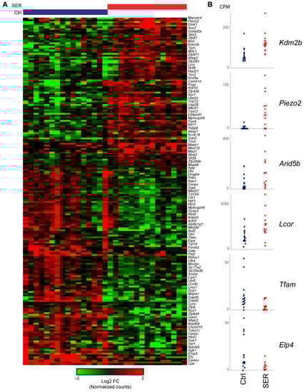 The histone modifications results described above are consistent with SER influencing the process of ZGA. Accordingly, we next sought to determine whether SER treatment altered embryo gene expression profiles shortly after ZGA. Single embryo RNA sequencing (RNA-seq) was performed on three independent batches of control- and SER-generated embryos. After correcting for batch effects, DESeq2 was used to identify 197 differentially expressed genes, as shown in Figure 6A. Data from individual embryos are shown in Figure 6B for several genes of interest to highlight the consistent differences observed between embryo groups. In terms of biological process, differentially expressed genes exhibited relatively little enrichment for significant gene ontology (GO) categories, with upregulated genes enriched for protein ubiquitination, and downregulated genes enriched for various mitochondrial annotations (not shown). However, although not enriched as a class, a number of key genes involved in histone modification and other facets of chromatin organization were among the most significant differentially expressed genes, including not only histone modifying enzymes (Kdm2b, Arid5b, Kat2b, Lcor) but also transcription factors (Nfatc2, Tfam, Zfp3, Stat2) and other chromatin regulators (Rad21). Altered expression of these genes in embryos derived using SER-treated sperm is, of course, of great future interest for understanding the altered epigenetic dynamics of these embryos.