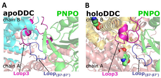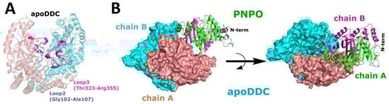 As pointed out above, both apoDDC (PDB 3RCH) and holoDDC (PDB 1JS3) structures are missing several residues that include Gly102-Ala107 and Thr323-Arg355 from the apoDDC, and Leu328-Gly339 from the holoDDC. The residues Thr323-Arg355 are part of a loop3 structure. We decided to model these missing residues and use the models for docking studies similar to those described above (see Materials and Methods for details). A computationally predicted apoDDC AlphaFold structure from the AlphaFold protein structure database [38] was found to be the most reliable model for this missing portion of the apo-protein, which was extracted and inserted into the crystal structure of 3RCH to create a model with an entire amino acid residue present, referred to as 3RCH-AF (Figure 1A). Docking PNPO to the 3RCH-AF model revealed a significant improvement in the formed interface and shape complementarity, and consequently, an improvement in the HINT scores of complex interface residues, i.e., from 2032 (~3.95 kcal mol−1) to 8650 (~16.8 kcal mol−1) for the most populous cluster (Figure 1B). HINT (hydropathic interaction) is an empirical forcefield based on experimental logPo/w values for interaction classification and scoring [39,40]. Notably, the 2 most populous clusters (both with a similar binding mode) account for 9.7% of the total generated solutions after modeling missing residues, compared to 14.7% when docked to the crystal structure with the missing residues incorporated (see Supporting Information Tables S1 and S2). Importantly, all top (most populated) clusters for the PNPO•apoDDC complex demonstrated that the surface loop (residues Gly235-Thr247) that connects strands β7 to β7′ on PNPO (termed loopβ7-β7′) was anchored to the dimeric interface of DDC, implying the possibility of transient “loop-mediated” interactions between the two proteins (Figure 1B). This protein–protein association involving the allosteric PLP binding site of PNPO and the active site of apoDDC was also observed for the PNPO•holoDDC complex (Figure 2), as discussed further below. Interestingly, the crystal structure of the human PNPO (PDB 1NRG) shows the β7′ strand, along with a portion of a turn and loopβ7-β7′, to be unique in the human enzyme as these structures are absent in the E. coli and yeast structures. Notably, loopβ7-β7′ of PNPO was observed to be in direct contact with the loop3 region (residues 323–357) of both apoDDC and holoDDC structures (Figure 3A,B).