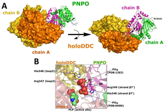 PNPO•holoDDC complex structure predicted using Cluspro 2.0. (A) Top predicted structure of the PNPO•holoDDC complex. (B) Superimposition of the crystal structures PNPO (PDB 6H00) and holoDDC (PDB 1JS3) over the PNPO•holoDDC complex model.