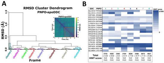 Hierarchical clustering and scoring of MD trajectories for the PNPO•apoDDC putative complex. (A) Hierarchical clustering analysis for the last 10 ns of trajectories (500 frames). (B) Frequencies and HINT scores of interacting key amino acid residues at the protein–protein interface with respect to clusters (~515 HINT unit = −1 kcal mol−1).