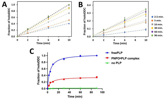 PLP transfer from PNPO•PLP to apoDDC. (A,B) Activation of apoDDC after 2.5, 5, 10, 30, 60, and 90 min of incubation with free PLP (A) and PNPO•PLP complex (B). (C) Final plot displaying dopamine formation at different activation time points. Data were fitted and analyzed using prism GraphPad software. The PLP transfer rate with free PLP, PNPO•PLP, or no PLP source is depicted by the blue, red, and green lines of fitted data, respectively.