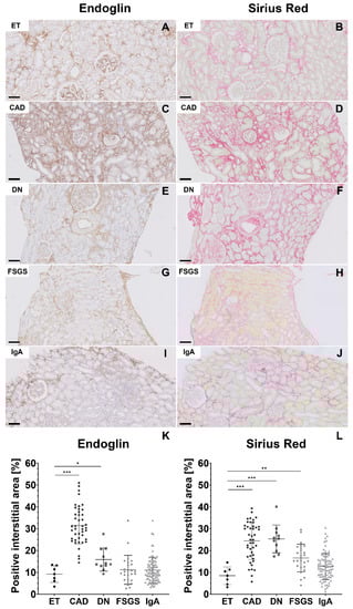 First, we stained paraffin-embedded serial sections of renal biopsies from patients with CAD, DN, FSGS and IgA nephropathy for endoglin and Sirius Red, which indicates the presence of collagen and measured the positively stained areas in the interstitium. As a control, the renal tissue of kidneys excluded for transplantation (ET) was stained. Representative images of the interstitial endoglin and Sirius Red staining of a control kidney and of different renal diseases are depicted in Figure 1A–J. Endoglin-positive staining was observed in the same areas as Sirius Red staining. The expression of endoglin was significantly higher in patients with CAD and DN compared to ET controls (respectively p < 0.001; p < 0.05; Figure 1K). The highest percentage of Sirius Red-positive area compared to ET controls was seen in patients with CAD, DN and FSGS (respectively p < 0.001; p < 0.001 p < 0.01; Figure 1L).