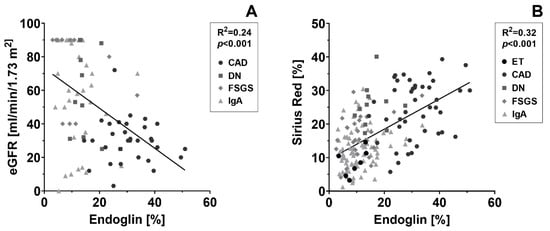 Endoglin expression correlates with kidney function and interstitial collagen deposition. (A) The interstitial area positive for endoglin is plotted against the estimated glomerular filtration rate (eGFR) per patient. The regression line is based on the pooled measurement of CAD, DN, FSGS and IgA nephropathy, which was considered justified after performing interaction analysis. R2 of the regression is 0.24, p < 0.001. (B) The interstitial area positive for endoglin is plotted against the Sirius Red-positive interstitial area, which is a measure for interstitial fibrosis. The regression line is based on the pooled measurement of ET, CAD, DN, FSGS and IgA nephropathy, which was considered justified after performing interaction analysis. Data were corrected for eGFR, R2 of the regression is 0.32, p < 0.001.