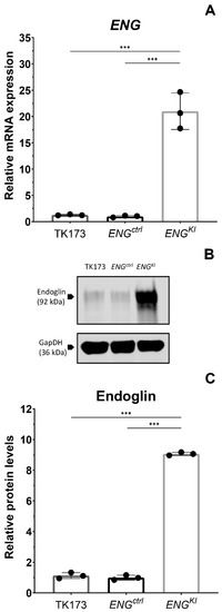 ENG mRNA and endoglin protein levels in TK173 human kidney fibroblasts lentivirally transduced with an endoglin and a control construct. (A) ENG mRNA levels measured using qPCR in non-transduced TK173 cells and TK173 cells transduced with an empty vector control (ENGctrl) or with a vector containing a full length ENG RNA sequence (ENGKI). Data are expressed relative to ENGctrl. Results were corrected for the housekeeping gene HPRT. (B) Endoglin protein levels in transduced ENGKI and ENGctrl and non-transduced TK173 cells were determined by Western blotting. The figure depicts a representative Western blot. (C) Quantification of the results obtained from the Western blots. Protein levels were corrected for the loading control GAPDH. Endoglin protein is expressed relative to ENGctrl. Data are presented as means ± SD from three independent experiments. *** p < 0.001 (Student’s t-test derived from a one-way ANOVA after log-transformation of the outcome variable).
