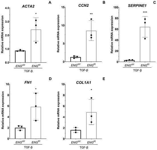 ENGKI fibroblasts have an increased TGF-β—induced profibrotic response at mRNA level. ENGctrl and ENGKI fibroblasts were incubated with 5 ng/mL TGF-β1 for 24 h, after which CCN2 (A), SERPINE1 (B), ACTA (C), FN1 (D) and COL1A1 (E) mRNA levels were measured using qPCR. The response to TGF-β stimulation is shown relative to their own unstimulated control. Results were corrected for the housekeeping gene HPRT. Summary data are presented as means ± SD from three independent experiments. * p < 0.05, ** p < 0.01 and *** p < 0.001 (Student’s t-test after log transformation).