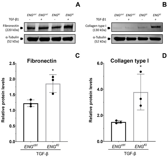 Finally, a Western blot was performed to measure the protein levels of fibronectin and collagen type I as a readout for the final result of pro-fibrotic TGF-β1 signaling. The TGF-β1-induced response was augmented in ENGKI compared to ENGctrl for both fibronectin (p < 0.05; Figure 5A,C) and collagen type I (p < 0.05; Figure 5B,D) which confirms the results at the mRNA level.