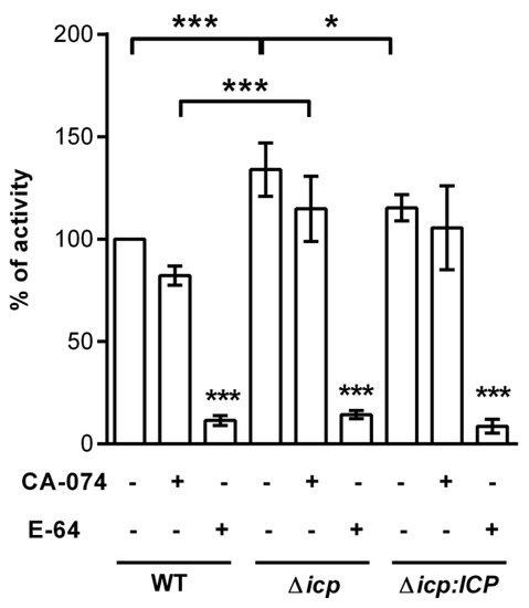 To check if ICP levels contribute to the modulation of cysteine peptidase activity in T. b. rhodesiense, we measured peptidolytic activity in parasite lysates using a fluorogenic substrate (Figure 2). In BSF lysates derived from Δicp, there was a 50% increase in the peptidolytic activity, as compared to lysates from wild-type (WT) or the complemented line, denoting increased cysteine peptidase activity in the absence of ICP. In BSF lysates from all tested lines, there was a prominent reduction in peptidolytic activity upon incubation with the wide-range irreversible inhibitor of papain-like enzymes, E-64, and a modest decrease with CA-074, an inhibitor of cathepsin B, indicating that the activities from papain-like peptidases were preferentially detected in the assay.
