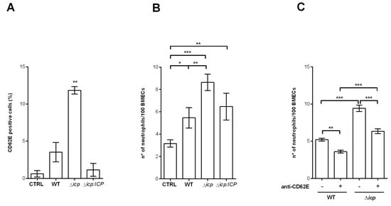 T. b. rhodesiense Δicp make HBMECs more susceptible to neutrophil adhesion. (A) Human BMECs were cultivated for 3 days, washed, and then incubated with BSF parasites of T. b. rhodesiense WT, Δicp, and Δicp:ICP for 18 h. Monolayers were washed, cells were detached, and cell surface E-selectin (CD62E) was detected by flow cytometry. (B) HBMECs (5 × 104) were seeded on glass coverslips and cultured for 3 days, after which BSF parasites of T. b. rhodesiense WT, Δicp, and Δicp:ICP were added at a 2:1 parasite:cell ratio for 18 h. Cells were then washed and 106 human neutrophils were co-cultivated for 1 h. CTRL refers to control HBMECs not exposed to parasites, and co-cultivated with the neutrophils only. (C) Following cultivation on coverslips, HBMECs were exposed to parasites, washed, incubated with anti-E-selectin antibody for 1 h and washed, prior to the addition of neutrophils, as above. After incubation with the neutrophils, cells were washed, fixed with 70% methanol and then Giemsa stained. The number of adhered neutrophils was determined by the counting of 100 HBMECs per coverslip under a light microscope. The experiments were performed in triplicate, (B) five independent times or (C) two independent times, and data are shown as the mean ± SD of a representative experiment. In (A), asterisks indicate significance to all other points. Asterisks indicate statistical significance at p < 0.05 (*), p < 0.01 (**), and p < 0.001 (***) as assessed by one-way ANOVA with Tukey’s post hoc test.
