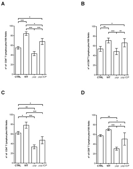 T. b. rhodesiense Δicp make HBMECs less susceptible to adhesion by T lymphocytes. Human BMECs (5 × 104) were seeded on glass coverslips and cultured for 3 days, after which BSF parasites of T. b. rhodesiense WT, Δicp, and Δicp:ICP were added at a 2:1 parasite:cell ratio for 18 h. CD4+ and CD8+ T cells (4 × 105) were bead-purified from human blood, and were either (A,B) non-activated or (C,D) activated in vitro with 5 µg/mL phytohemagglutinin prior to addition to HBMECs. The cells were then co-cultivated for 2 h. CTRL refers to HBMECs cultivated with either activated or non-activated T cells only. Following this, cells were washed, fixed with 70% methanol and then Giemsa stained. The number of adhered T lymphocytes were determined by the counting of 100 HBMECs per coverslip under a light microscope. The experiments were performed in triplicate, three independent times, and data are shown as the mean ± SD of a representative experiment. Asterisks indicate statistical significance at p < 0.05 (*), p < 0.01 (**), and p < 0.001 (***) as assessed by one-way ANOVA with Tukey’s post hoc test.