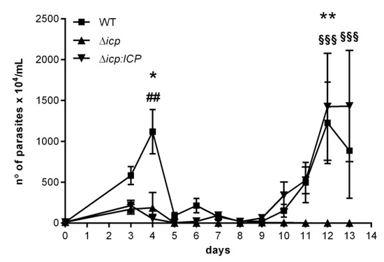 Given the observations that ICP plays a role in the ability of the parasite to alter the properties of endothelial cells and how they interact with leukocytes, we adopted the mouse model to address whether ICP could further influence the host–parasite interaction. We had previously described an infection model for T. b. rhodesiense using C57BL/6 mice, that displays sequential waves of blood parasitemia and visible signs of motor disability [28]. In the present study, infected mice displayed the first wave of parasitemia around day 4 post-infection and the parasite loads in mice infected with WT parasites were approximately 10-fold higher than those observed in mice infected with Δicp (Figure 7). Mice infected with the complemented line Δicp:ICP also displayed reduced parasitemia during the first wave. Since there should not be antibody-mediated anti-parasite immunity at day 3–4, the low parasite burdens in the first wave could be a reflection of the slower growth observed in vitro for Δicp and Δicp:ICP. At day 10, a robust parasitemia wave commenced, peaking at day 12–13 in mice infected with WT or Δicp:ICP parasites, while we could not detect parasites in the blood of mice infected with Δicp. These results indicate that ICP is essential for maintaining an infection in mice over 14 days.
