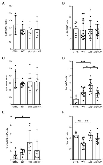 T. b. rhodesiense Δicp induces increased recruitment of monocytes to the inoculation site during early infection of C57BL/6 mice. C57BL/6 mice were infected with BSF parasites of T. b. rhodesiense WT, Δicp, and Δicp:ICP (1 × 105 parasites per animal). On the second day post-infection, mice were euthanized, and the peritoneal cavity was washed with RPMI in order to collect the peritoneal cells. The peritoneal cells were submitted to flow cytometry to assess expression of (A) CD11c, (B) CD11b, and (C) F4/80 within the total cell population, and (D) Ly6C+Ly6G− cells and (E) Ly6C+Ly6G+ within the CD11b+ population. (F) Expression of NK1.1 within the total cell population. CTRL represents the non-infected control that was injected with RPMI medium. Graphs show individual points representing each mouse sample and the mean ± SD of two or three combined experiments (n ≥ 3 per group per experiment). Asterisks indicate statistical significance at p < 0.05 (*), p < 0.01 (**), and p < 0.001 (***) as assessed by one-way ANOVA with Tukey’s post hoc test.