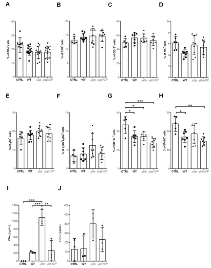 The spleen cellular population was then analyzed at day 2 to verify if there were detectable alterations during initial infection. As anticipated, we did not observe alterations in the lymphocyte subsets of adaptive response, CD4+ T cells (Figure 9A), CD8+ T cells (Figure 9B), CD19+ B cells (Figure 9C), and neither in the NK subset (Figure 9D). Monocytes (Figure 9E) and neutrophils (Figure 9F) were likewise unaltered in infected mice as compared to control mice, while there were noticeably less DCs (Figure 9G) and resident macrophages (Figure 9H) in infected mice. We then selected IFN-γ and TNF-α, which are hallmarks of inflammation, to address whether there were any functional alterations in the spleen environment at day 2. We detected a substantially significant production of IFN-γ by splenocytes derived from mice infected with Δicp, as compared to those infected with WT or Δicp:ICP parasites and control mice (Figure 9I), denoting increased inflammation during early infection. The production of TNF-α, albeit also increased, was too variable to allow definite conclusions (Figure 9J).