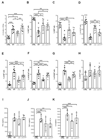 Considering that mice infected with Δicp lacked detectable blood parasitemia at day 13, we verified the status of the immune cells in the spleen at day 14. As expected, the cellularity was overall higher in the spleens of infected mice as compared to uninfected controls (Figure 10A). However, there was a significant decrease in the cellularity of mice infected with Δicp, which could reflect that the immune response was receding. However, the analyses of lymphocyte subsets showed that mice infected with Δicp retained a significantly higher number of T and B cell subsets in the spleen (Figure 10B–D), as compared to mice infected with WT or Δicp:ICP parasites, which could in principle, contribute to specific anti-parasite immunity. In contrast, cellular subsets typically related to innate responses, such as NK cells (Figure 10E), myeloid cells (Figure 10F), macrophages (Figure 10G), and neutrophils (Figure 10H), were decreased in the spleens of mice infected with Δicp, as compared to other infected mice, while still sustained at higher levels as compared to uninfected controls. The cytokine profile showed an equally high inflammatory response in all infected mice, as determined by levels of IFN-γ (Figure 10I), TNF-α (Figure 10J), and IL-6 (Figure 10K). Taken together, these results indicate that in the absence of ICP, the host not only triggers an inflammatory response earlier, but also sustains it throughout infection, while preserving the lymphocyte subset that could ultimately help in the control of parasite burden.
