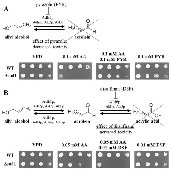 Metabolism of allyl alcohol (AA) and acrolein (Acr) in the Saccharomyces cerevisiae yeast. The wild-type (WT) strain and Δsod1 mutant were cultivated in the YPD liquid medium for 16 h, diluted serially (1:10), and suspensions were spotted onto solid YPD plates containing allyl alcohol (0.05- or 0.1 mM AA) and 0.1 mM pyrazole (PYR) (A) or 0.01 mM disulfiram (DSF) (B). Successive spots contained 50,000, 5000, 500, and 50 cells. Plates were cultivated at 28 °C and colony growth was recorded after 48 h.