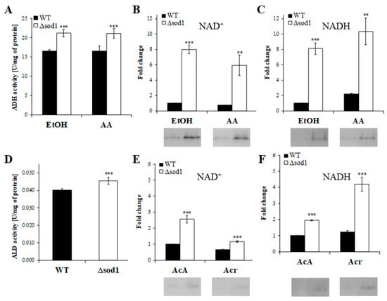 Activity of alcohol dehydrogenase (ADH) and aldehyde dehydrogenase (ALD) in the whole-cell protein extracts prepared for the wild-type (WT) strain and Δsod1 mutant. ADH activity was determined by measuring the rate of NAD+ reduction at 340 nm with ethanol (EtOH) and allyl alcohol (AA) (A) and by staining in the gel after native PAGE electrophoresis with ethanol (EtOH) and allyl alcohol (AA) as substrates as well as with NAD+ (B) and NADH (C) as reaction cofactors. ALD activity was determined with 6-methoxy-2-naphthaldehyde as a substrate in the presence of NAD+ (D). Fluorescence signal increase was recorded at λex = 310 nm and λem = 360 nm. ALD activity was determined by also staining in the gel after native PAGE electrophoresis with acetaldehyde (AcA) and acrolein (Acr) as substrates as well as with NAD+ (E) and NADH (F) as reaction cofactors. The results are presented as mean ± SD from four independent experiments in each case. ** p < 0.01, *** p < 0.001 as compared to the results for the WT strain.