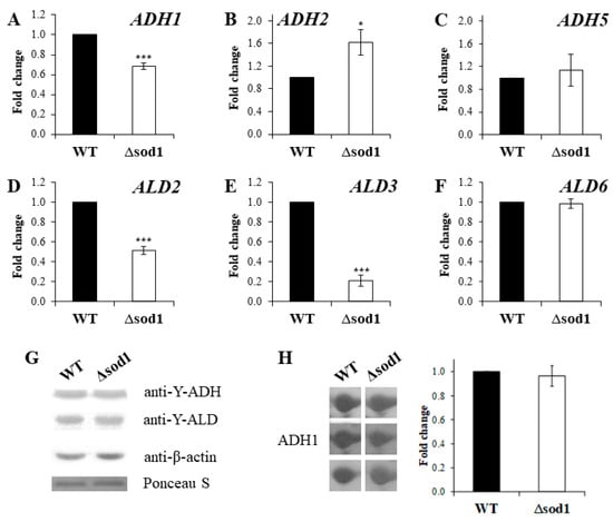 ADH and ALD gene expression and ADH and ALD protein content in the wild-type (WT) strain and Δsod1 mutant. ADH (A–C) and ALD (D–F) gene expression were performed by qPCR assay with TaqMan probes. The relative gene expression was calculated with a comparative CT method: the −ΔΔCT method for comparison of individual gene expression between the WT and Δsod1 mutant. The results are presented as mean ± SD from three independent experiments. * p < 0.05, *** p < 0.001 as compared to the results for the WT strain. The ADH and ALD proteins were detected by the immunoblotting assay with the primary antibodies: anti-yeast alcohol dehydrogenase (1:5000), anti-yeast aldehyde dehydrogenase (1:5000), and anti-β-actin (1:5000) with the horseradish peroxidase-conjugated secondary antibodies (1:10,000 or 1:10,000) and a chemiluminescent substrate (G). Protein identification was performed by two-dimensional gel electrophoresis and then by liquid chromatography coupled to the mass spectrometer. The picture represents the results from three independent experiments (H).