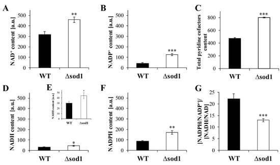 Individual (A,B,D–F) and total (C) pyridine nucleotide cofactors content and [NADPH/NADP+]/[NADH/NAD] ratio (G) in the wild-type strain (WT) and Δsod1 mutant. The content of pyridine nucleotide cofactors was assessed with NAD/NADH-Glo and NADP/NADPH-Glo assays. Data are presented as mean ± SD from three independent experiments. * p < 0.05, ** p < 0.01, *** p < 0.001 as compared to the WT strain.