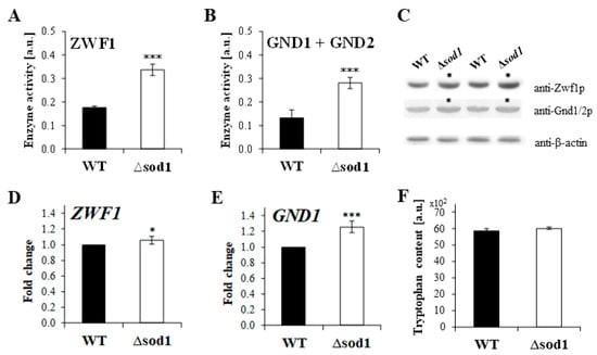 Activity, gene expression, and protein detection of glucose-6-phosphate dehydrogenase (ZWF1) and 6-phosphogluconate dehydrogenase (GND) in the wild-type (WT) strain and Δsod1 mutant. The activity of glucose-6-phosphate dehydrogenase (ZWF1) was calculated by subtracting the activity of GND1 and GND2 from the total enzyme activity (A). The total activity of the PP pathway dehydrogenases (sum of both ZWF1 and GND1/GND2 activities) was determined with D-glucose-6-phosphate and 6-phosphogluconate as substrates and 6-phosphogluconate dehydrogenase (GND1 and GND2) activity was determined with 6-phosphogluconate, in the presence of NADP+ (B). The ZWF1 and GND1/2 proteins were detected by immunoblotting assay with the primary antibodies: anti-glucose-6-phosphate dehydrogenase (1:2000), anti-6-phosphogluconate dehydrogenase (1:2000), and anti-β-actin (1:5000) and with the horseradish peroxidase-conjugated secondary antibodies (1:10,000 or 1:10,000) with a chemiluminescent substrate (C). ZWF1 (D) and GND1 (E) gene expression was performed by qPCR assay with TaqMan probes. The relative gene expression was calculated with a comparative CT method: the −ΔΔCT method for comparison of individual gene expression between the WT and Δsod1 mutant. The results are presented as mean ± SD from three independent experiments. * p < 0.05, *** p < 0.001 as compared to the results for the WT strain. The tryptophan content in the cell extracts was determined by fluorimetric measurements at λex = 290 nm and λem = 325 nm. The results are presented as mean ± SD from three independent experiments.