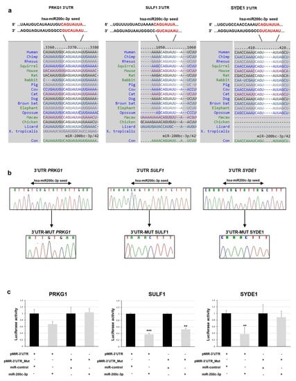 (a) Predicted pairing of hsa-miR-200c-3p seed sequence with its target genes is highlighted (upper panel). Positions 3368–3375 of PRKG1 3′-UTR, 1052–1059 of SULF1 3′-UTR, and 413–420 of SYDE1 3′-UTR are highlighted. Seed sequences are highlighted in red. Conserved hsa-miR-200c-3p seed sequence among indicated species is shown. (b) Electropherograms showing DNA sequencing analysis of cloned PRKG1, SULF1, and SYDE1 3′-UTR with (upper panel) or not (lower panel) hsa-miR-200c-3p seed sequence. Nucleotide sequences are provided. (c) Relative luciferase activity of pmirGLO recombinant vector containing PRKG1, SULF1, and SYDE1 3′-UTR fragments. HEK293 cells were cotransfected with reporter constructs carrying a wild type or miR-200c-3p seed deleted 3′-UTR regions of PRKG1, SULF1, and SYDE1 and a synthetic mimic of miR-200c-3p or miR-control. The luciferase activity was normalized with respect to the level of Renilla luciferase. Normalized activities of all the 3′-UTR fragments were compared with the empty pmiR vector. Each biological replicate (n = 3) was run in three technical replicates. Scale bars represent standard errors (** p < 0.05, *** p < 0.01).