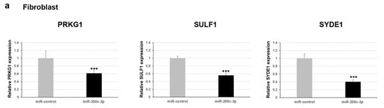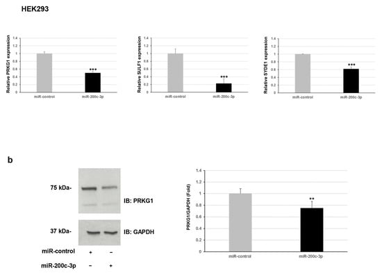 (a) Expression profile of PRKG1, SULF1, and SYDE1 in fibroblast (upper panel) or HEK293 cells (lower panel) transfected with hsamiR-200c-3p mimic or miR-control by quantitative PCR. Each biological replicate (n = 3) was run in three technical replicates. Scale bars represent standard errors (** p < 0.05, *** p < 0.01). (b) Whole protein lysates from HEK293 transfected with hsa-miR200c-3p or miR-control were separated on 10% SDS-gel and subjected to immunoblotting with antiPRKG1 and antiGAPDH antibodies. Levels of PRKG1 and GAPDH were quantified by densitometry using IMAGEJ analysis software. Relative PRKG1 level was normalized compared to GAPDH level. Scale bars represent standard errors (*** p < 0.01, biological replicates = 3). Whole protein lysates from HEK293 transfected with.